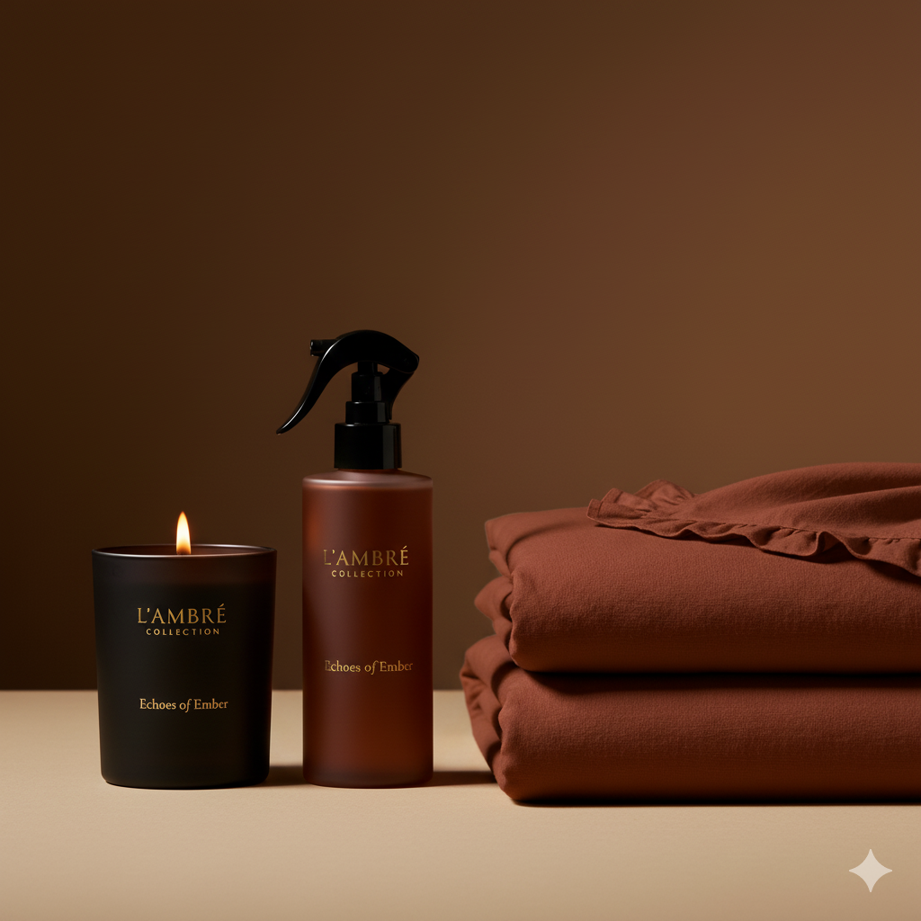 Het Echoes of Ember Ritueel Pakket biedt een onvergetelijke beleving van comfort. De set combineert het roestbruine Echoes of Embre dekbedovertrek met de diepe warmte van Geroosterde Amber & Patchouli uit de bijpassende Spray en Geurkaars. Een compleet ritueel voor luxe en rust.